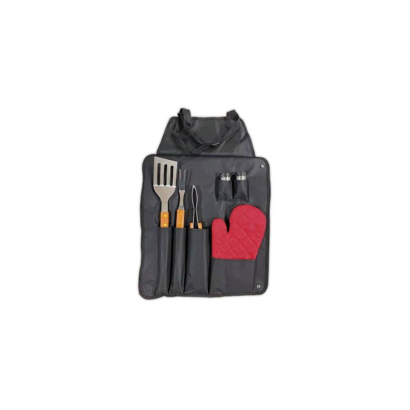 Il set è composto da: spatola, forchettone, pinza, set sale e pepe, guanto e frembiule.